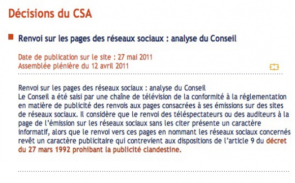Ben voilà autre chose. Comme vous pouvez le lire sur cette décision du CSA, lorsque les chaines de TV ou radios renvoient leurs téléspectateurs ou auditeurs sur les réseaux sociaux en nommant ces derniers, ils font de la publicité clandestine. Donc, les TV et les radios ne devraient plus prononcer les mots Facebook ou Twitter...