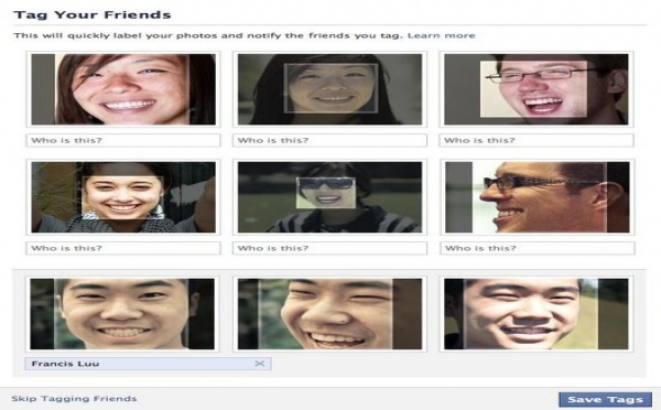 Dans l'image ci dessus, on voit un exemple de Tagging de photo sur Facebook par reconnaissance faciale. Les 3 visages du bas ont été reconnus identiques et le nom de la personne apparaît.Les visages du dessus ne semblent pas, selon le service de reconnaissance faciale de Facebook, identiques donc, aucun nom n'est...