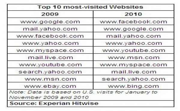 Comme vous pouvez le voir sur le tableau ci dessus, le Top 10 des sites les plus visités aux USA en 2010 c'est bel et bien Facebook . ( à voir aussi les connexions Facebook )Facebook qui devance Google et Yahoo, voilà qui devrait lancer une belle course poursuite pour l'années 2011.En terme de recherche, là aussi Facebook...
