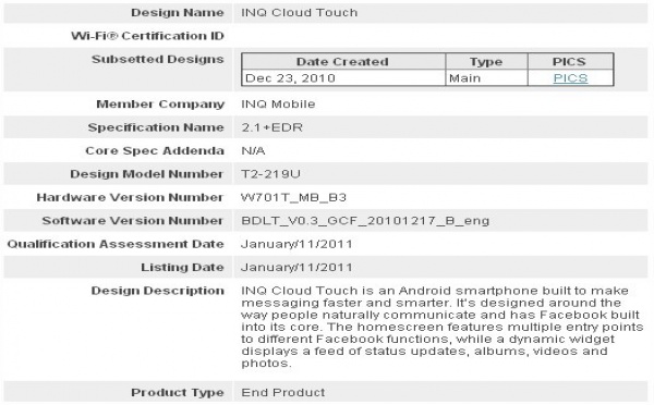 Le screen ci-dessus montre la validation d'un mobile par Bluetooth Sig, de la marque INQ Mobile, tournant sous Android et offrant, en page d'accueil, différentes fonctions pour Facebook.Du coup, et à juste titre, la rumeur d'un Facebook Phone refait son apparition avec " preuves " à l'appui.Maintenant, rien ne nous dit...