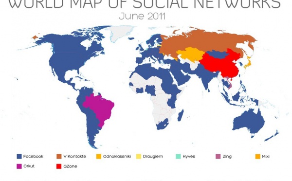 La mappemonde des réseaux sociaux - Domination de Facebook - 15/06/2011