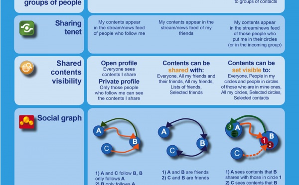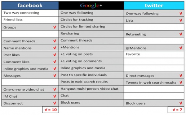 Google + vs Facebook vs Twitter - Tableau comparatif des fonctionalités - 18/07/2011
