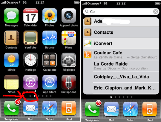Sur la photo de gauche, j'ai entouré une petite loupe que vous trouverez sur l'iPhone après avoir installé le Firmware 3, celle-ci indique la présence de Spotlight.