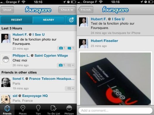 Foursquare a mis à jour son application iPhone aujourd'hui et intègre maintenant la possibilité d'ajouter une photo et de commenter. ( comme vous le voyez sur les screens ci dessus )