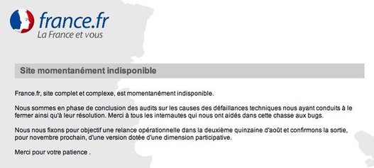 France.fr, le site de la France, le site parlant 5 langues, sensé représenter la France, avec un budget faramineux de 1,6 Millions d'€ est mort ... du moins pour un moment.