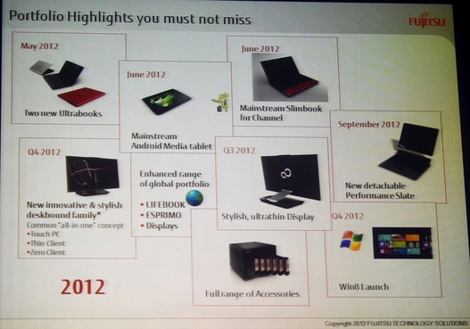 L'année 2012 s'annonce, visiblement, comme le grand retour de Fujitsu dans le petit monde de la mobilité. L'image ci-dessus représente la Roadmap de Fujitsu pour certains appareils et comme vous pouvez le voir, une tablette tactile devrait faire son apparition ainsi qu'une tablette avec son clavier et bien d'autres choses.