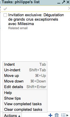 D'abord Task, visible sur l'image ci-contre, qui est une To-Do List intégrable à Gmail via le Labs et qui permet donc de se mettre des penses bêtes à portée de vue, et également, la chose sympa, c'est que ces pense bête peuvent être simplement le titre d'un mail reçu, il suffit pour cela de choisir " ajouter à Task " dans les actions lorsque vous lisez un mail.