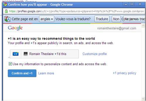 Cette fonctionnalité n'est valide que sur Google.com pour le moment suivi d'une identification avec votre adresse GMail, pour ceux qui voudrait participer à l'experimentation de Google +1 , vous pouvez vous rendre sur ce lien afin d'activer l'outil.