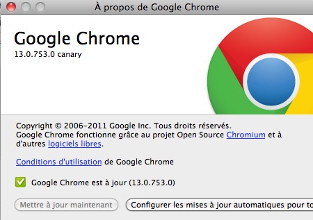 Les utilisateurs de Windows ont accès à cette version depuis l'an passé, et alors que Google Chrome 11 vient tout juste d'être mise en ligne pour tous les OS, et que l'on parle de la version 12, Google Chrome Canary correspond à la version 13 de Google Chrome . Vous pouvez donc participer au développement en signalant d'éventuels bugs ou autres.