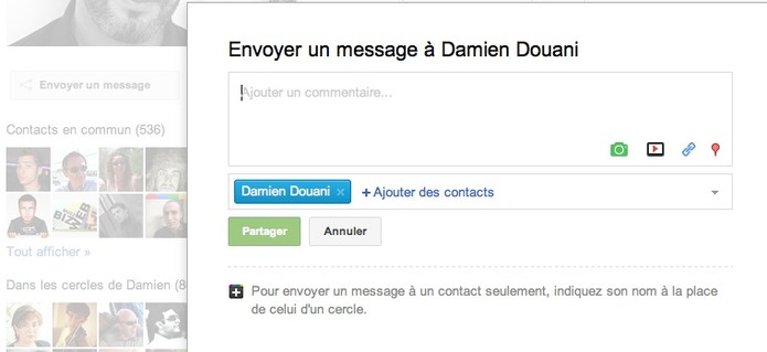 Comme vous le voyez, un nouveau bouton vient d'apparaître sous la photo de profil de Google Plus qui permet d'envoyer un message à la personne directement. Une fois que l'on a cliqué sur " Envoyer un message ", voilà comment cela se présente.