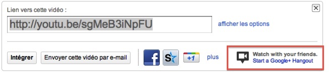 C'est ce que Google appelle le Hangout et Youtube vient d'intégrer un bouton qui permet en un clic de sélectionner une vidéo et de la partager au lieu de faire un copier-coller dans Google Plus ce qui fait gagner un peu de temps.