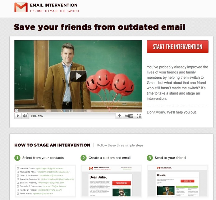 Alors Google vous file un coup de main avec Email Intervention, qui va vous permettre de créer un mail, d'ajouter tous vos contacts qui ne sont pas sous Gmail et de leur envoyer cet email avec du Google dedans et un petit bouton à cliquer pour aller se créer une adresse.