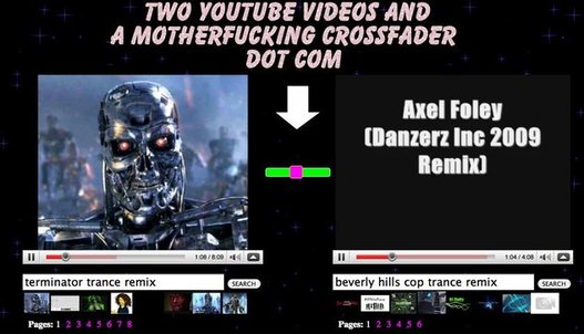 Le site TwoYoutubeVideosAndAMotherfuckingCrossfader.com ( je ne le répèterais pas ) propose 2 vidéos Youtube avec un CrossFader.