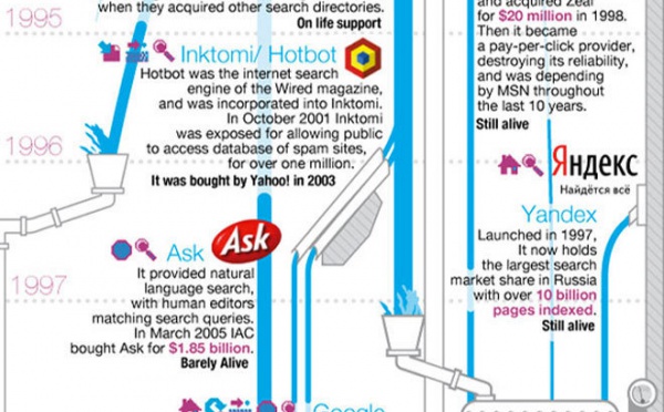 Les infographies sur l'historique des moteurs de recherche ne manquent pas, nous en avions déjà vu 2 sur AccessOWeb ( celle-ci et celle-là )Cette nouvelle infographie est plus complète que les précédentes, et du coup la lecture est un peu plus difficile je trouve.source