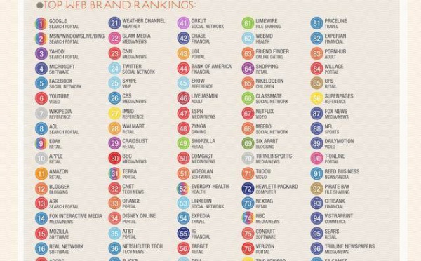 Sur cette infographie sont représentés les logos ou du moins les couleurs qu'utilisent les grands noms du Web mondial.Bon, finalement AccessOWeb est dans la tendance mais pas dans la liste ... dommage ... ce doit être le mot " grand " pour " grands noms " qui ne doit pas correspondre :Dsource