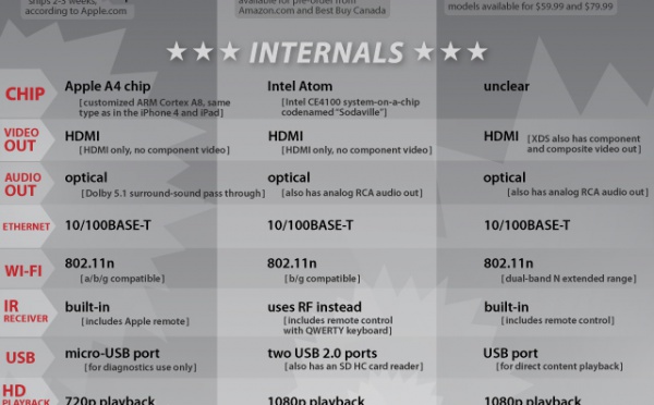 Voilà une infographie qui permet de comparer l'Apple TV, la Boxee Box et la Box Rocu, mais il manque un adversaire de poids, la Google TV.A vous de faire votre choix :)source