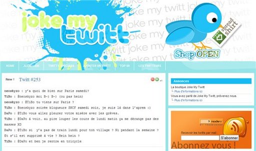Joke My Twitt, tenu par DaPo et Dimitri, est un site de recueil d'anecdotes recueillies sur Twitter, et je dirais même sur un grand nombre de compte Twitter, au fil des discussions.
