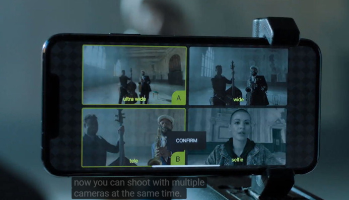 Apple propose un truc intéressant avec ce nouvel iPhone 11 Pro, c'est de proposer la capacité à des applications tierces de pouvoir gérer manuellement chaque objectif. Par exemple comme vous pouvez le voir sur l'image ci-dessus on peut cadrer comme on le souhaite le capteur grand angle, l'ultra grand angle, le téléobjectif et même le capteur frontale dans la même vidéo comme des sources différentes et après il ne reste plus qu'à faire le montage.