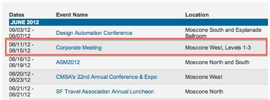 Le planning de réservation du Moscone Center de San Francisco, en image ci-dessus, atteste d'un meeting d'une entreprise entre les 11 et 15 juin 2012, ce qui tend à correspondre aux dates qu'Apple utilise pour sa grande conférence annuelle des développeurs.