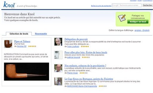 Une bonne nouvelle pour tous les rédacteurs francophone de Knol ou tous les futurs rédacteurs, la home page de Knol est arrivée en français présentant bien entendu des articles en français.