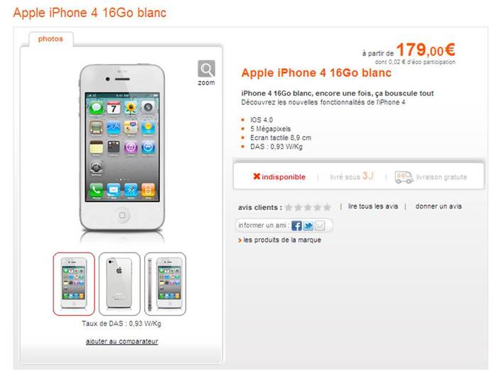 Orange vient de mettre en ligne la fiche descriptive de l'iPhone 4 blanc 16 et 32 Go. On peut trouver son prix qui est de 179€ pour la version 16 Go et 349€ pour la version 32 Go. Il n'apparait pas encore dans la liste des produits Apple.