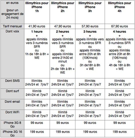 Comme vous le voyez, l'iPhone 3G 8 Go sera dispo chez SFR au prix de 99 Euros et l'iPhone 16 Go au prix de 199 € ( ce qui est identique chez Orange )