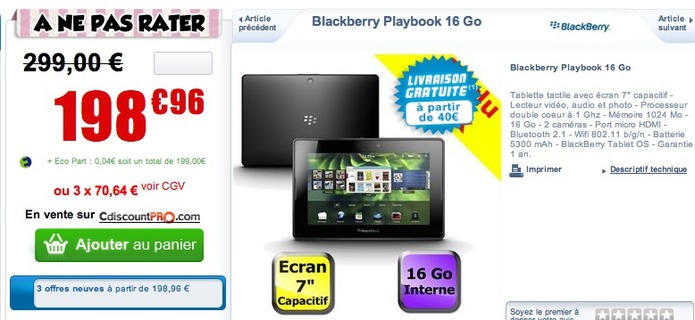 Si vous avez besoin d'une tablette tactile facilement transportable, dans un modèle 7 pouces, il est peut être l'heure de se diriger vers une Blackberry Playbook que Cdiscount propose aujourd'hui à prix cassé.