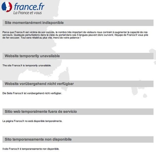 Et oui, France.fr est victime de son succès, un jeudi, à 7h du matin, très certainement dû à un afflux de visite du monde entier. ( peut être dû à l'article de Techcrunch)