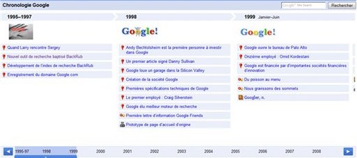 Google, de 1995 à 2008, année par année, toute la chronologie de Google dans les moindres détails, chaque lien est cliquable, et vous ouvrira une fenêtre explicative, et en français svp. ( même si le départ du site est en anglais )