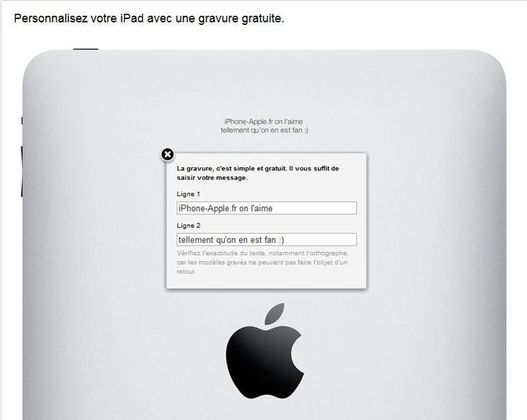 Cela fait déjà quelques années que l'option gravure est disponible pour iPod. Concernant l'iPad, l'option se faisait attendre mais est enfin disponible. Vous pouvez désormais faire graver un message personnalisé sur l'arrière de votre iPad pour un de vos proche ou pour vous-même.