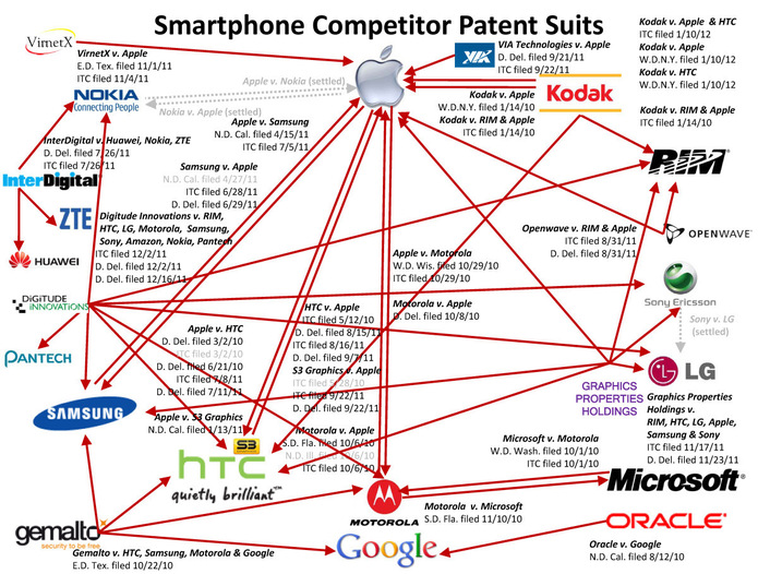 Nous avions publié une infographie à propos de cette guerre de brevets et IntoMobile en a réalisé une nouvelle, celle ci-dessus, montrant à quel point la rivalité est importante et nous voyons également quelles sont les entreprises suscitant le plus de jalousie.