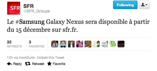 C'est sur son twitter officiel que l'opérateur SFR a annoncé que le très attendu Galaxy Nexus sera proposé dès le 15 décembre sur le site SFR.fr