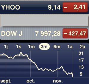 Alors qu'on parlait d'un sursaut de l'action à l'annonce du départ de son CEO Jerry Yang, il n'a fallu qu'un jour pour la voir s'écrouler atteignant la barre des 9.14 Dollars, perdant tout de même 2.41 Dollars en 1 jour ....