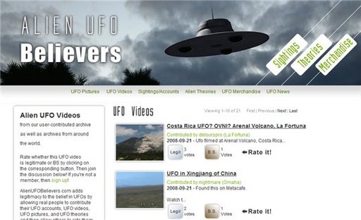 Alien UfFO Beliviers est un site, sous forme de Digg Like, qui vous invite à découvrir ou re-découvrir des photos ou des vidéos d'OVNI ou du moins de soit disant OVNI.