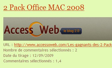 Vous avez été très nombreux à m'envoyer un mail afin de participer au jeu pour gagner l'un des 2 Pack Office MAC 2008 Microsoft présenté dans ce billet.