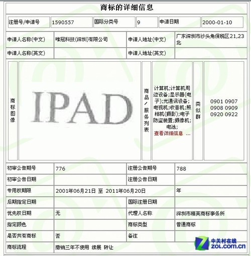 Ci dessous, le certificat de paternité de la marque iPad de Preview Technology