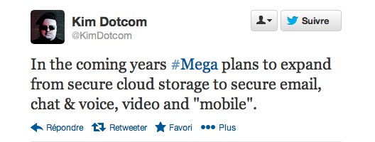 Mais comme l'ambition de Kim Dotcom est énorme, l'homme ne s'arrête pas là . Hier, toujours via Twitter, comme vous pouvez le voir sur l'image ci-dessous, Kim Dotcom a annoncé que, dans les années à venir, il offrira des services pour sécuriser nos mails, chat, voix, vidéos et mobiles.