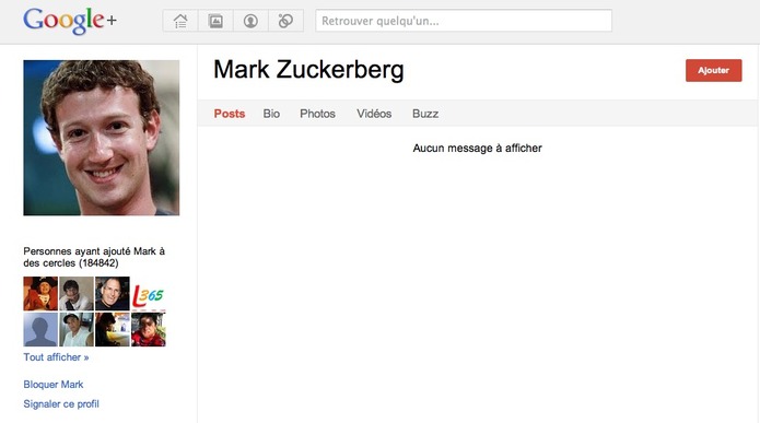 Mark Zuckerberg, le profil le plus suivi sur Google + mais aussi le plus vide de tous les profils existants. Le patron de Facebook a même fait en sorte que personne ne puisse lire quoi que ce soit sur lui.