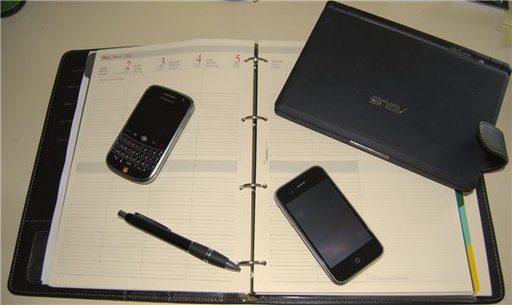 Comme vous le voyez sur la photo, au quotidien j'utilise un agenda, du moins un Notebook version papier ( un petit Oberthur version A4 très classe ), mon eeePC 701 pour prendre des notes rapides en réunion ( j'utilise Evernote dessus que je synchronise ensuite avec mes PC ...maison ou boulot ... selon la rapidité à laquelle je dois traiter les données ), le Blackberry BOLD pour les emails, Twitter ( un peu ), Gtalk ( un peu ) et l'iPhone qui est à la base mon téléphone perso dont tout le monde a le numéro.