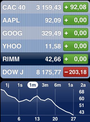 Aujourd'hui, c'est le cas, puisqu'avant l'ouverture de la Bourse Américaine l'action de RIM pointe à 42.66 Dollars, son cours le plus bas depuis 1 an 1/2 .