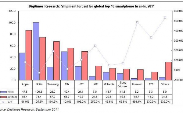 Les prévisions de Digitimes indique qu'Apple pourrait finir l'année 2011 en tête des constructeurs pour ce qui est des expéditions de smartphones. Avec 86,4 Millions d'iPhone expediés et une croissance (vis-à-vis de l'année précédente) de 81,9%, Apple finirait la course seul en tête. Mais le géant pommé ne peut pas...