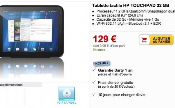 Darty propose la HP Touchpad 32 Go à 129 € - 23/08/2011