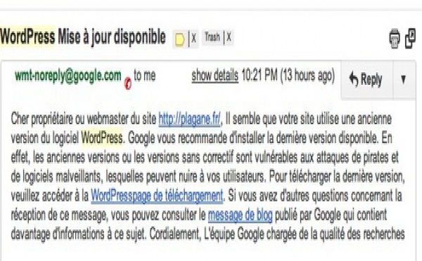 J'ai toujours un ancien blog, à mon nom, sur lequel je publiais quelques trucs de temps à autre mais dont je ne m'occupe plus depuis un moment, un blog que j'aurais dû fermer mais bon... Ce blog est sous Wordpress et un ancien Wordpress si j'ose dire, un Wordpress de collection :) J'ai reçu ce mail de la part de Google,...