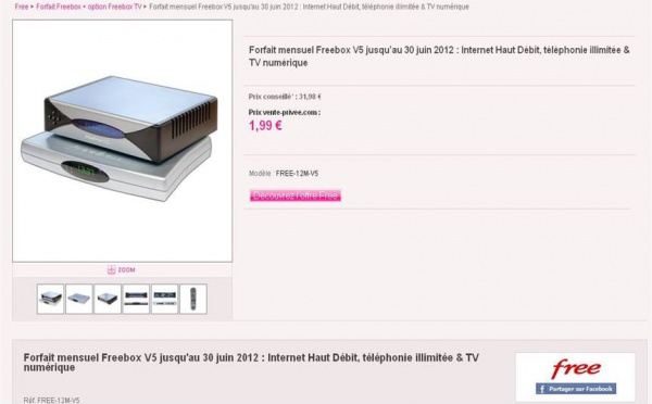 C'est aujourd'hui que débute la vente privée Free et on peut dire que l'opérateur frappe un grand coup avec la proposition d'un abonnement internet à 1.99€/mois pendant 1 an, oui vous ne rêvez pas, bon pour ce prix vous ne pourrez avoir "que" la Freebox V5 mais l'option TV est inclue. Ce tarif est donc valide...
