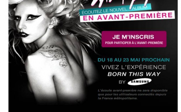 La chanteuse superstar Lady Gaga s'apprête à sortir son nouvel album "Born This Way" le 23 mai en France mais grâce à Samsung, vous allez pouvoir dès le 18 mai écouter en avant première son nouvel album sur la page Facebook de Samsung France. Les internautes vont pouvoir écouter entièrement son nouvel album,...