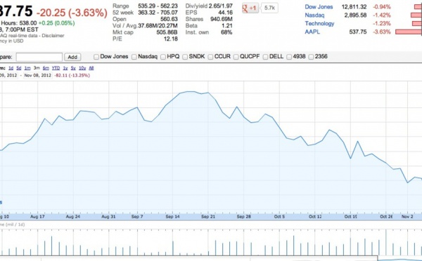 Apple, du moins l'action d'Apple (AAPL) n'est vraiment pas au mieux de sa forme, c'est même pire que ça puisque l'action d'Apple a perdu plus de 160 $ en moins de 45 jours. Avant que l'iPhone 5 ne soit présenté par Tim Cook, l'action ne faisait que monter, pour atteindre le seuil des 702 $, ce qui permettait à Apple d'avoir...