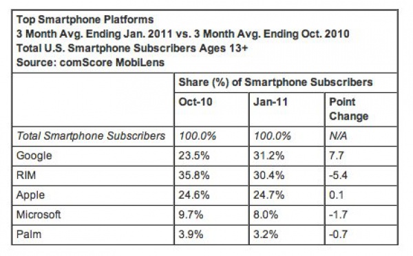 Android en tête devant Apple et RIM aux US - 08/03/2011