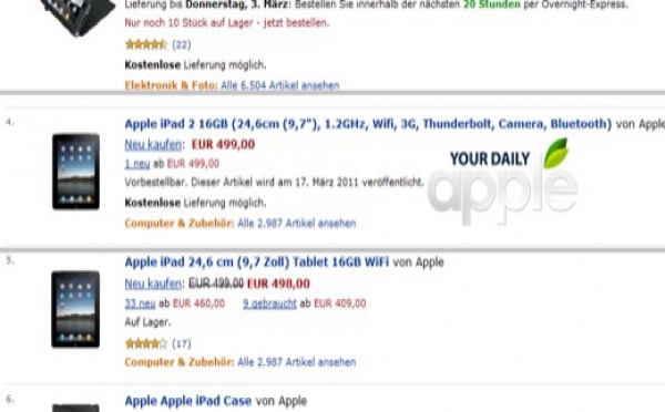 update: Keynote Apple iPad 2 en direct live Ce soir, Apple va présenter la nouvelle version de l'iPad 2 et il semblerait que Amazon Allemagne ait mis un peu trop vite à disposition le nouveau modèle sur son site.C'est le site YourDailyApple qui a reperé cette fuite proposant l'iPad 2 à partir du 17 mars avec...