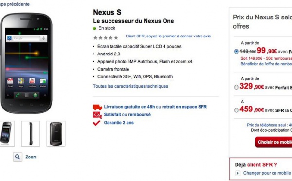 Le Nexus S est maintenant en vente chez SFR et vous pourrez choisir entre 2 couleurs, le noir ou le blanc.Les tarifs proposés par SFR vont de 99,90 € ( 149,90 - 50€ de remboursement ) avec un forfait 1h à 42,30 €/mois à 459,90 € avec SFR la carte.Notons tout de même que vous pouvez acheter le Nexus S seul pour 469 €.Perso je...
