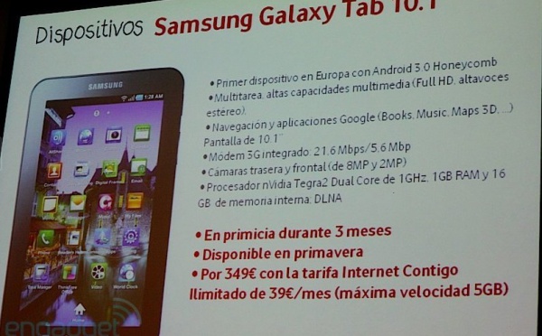 Samsung Galaxy Tab 10.1 - Les tarifs Vodafone pour l'Espagne - 27/02/2011